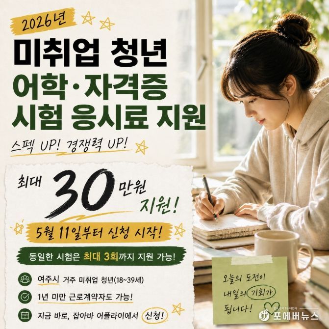 [ 포에버뉴스 김경순 기자 ] 여주시는 오는 5월 11일부터 미취업 청년에 어학·자격시험 응시료를 지원하는 ‘경기청년 역량강화 기회지원’ 사업 접수를 시작한다.