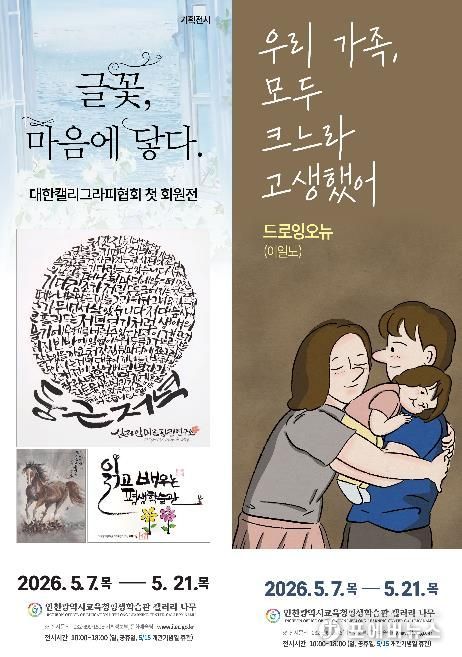 [ 포에버뉴스 김경순 기자 ] 인천광역시교육청평생학습관은 5월 7일부터 21일까지 관내 갤러리 '나무'와 '다솜'에서 '글꽃, 마음에 닿다'와 '우리 가족, 모두 크느라 고생했어' 전시를 각각 개최한다.