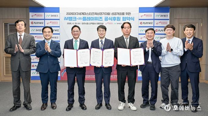 [ 포에버뉴스 사공선 기자 ] 2026대구세계마스터즈육상경기대회 조직위원회는 4월 29일 시청 산격청사에서 iM뱅크 및 ㈜플레이위즈와 대회 공식 후원협약을 체결했다.