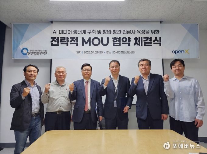 [ 포에버뉴스 김경순 기자 ] 한국인터넷신문방송기자협회(회장 전병길, 이하 협회)와 오픈엑스(대표 김미진)는 지난 2026년 4월 27일 서울 상암동 DMC첨단산업센터에서 업무협약(MOU)을 체결하고, 제휴 언론사 육성과 건강한 미디어 생태계 강화를 위해 적극 협력하기로 뜻을 모았다.