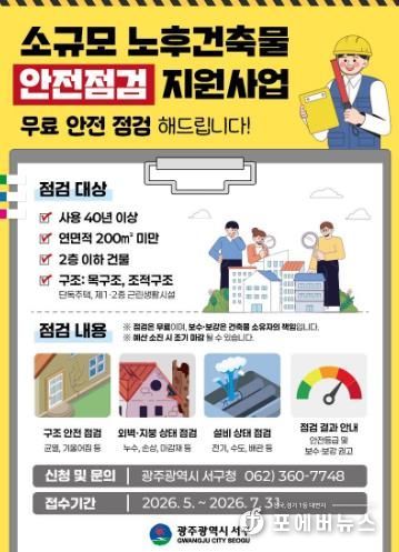 김이강 서구청장은 “안전관리 사각지대에 놓여 있던 소규모 노후 건축물까지 점검을 확대해 주민 불안을 해소하겠다”며 “선제적인 안전점검과 체계적인 사후관리를 통해 생활 속 안전사고를 예방하겠다”고 말했다.