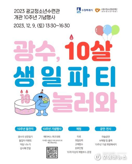 수원시청소년청년재단 광교청소년수련관은 오는 12월 9일, 개관 10주년 기념행사 ‘광수, 10살 생일파티 놀러와’를 개최한다고 밝혔다..