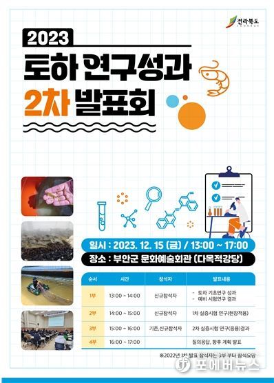 [ 포에버뉴스 이승훈 기자 ] 전라북도 수산기술연구소는 토하 양식기술에 대한 대국민 관심과 문의가 높아짐에 따라, 15일 부안예술회관에서 전국의 민·관 희망자를 대상으로 그간 연구성과 및 향후 추진계획에 대한 2차 발표회를 개최한다고 12일 밝혔다.
