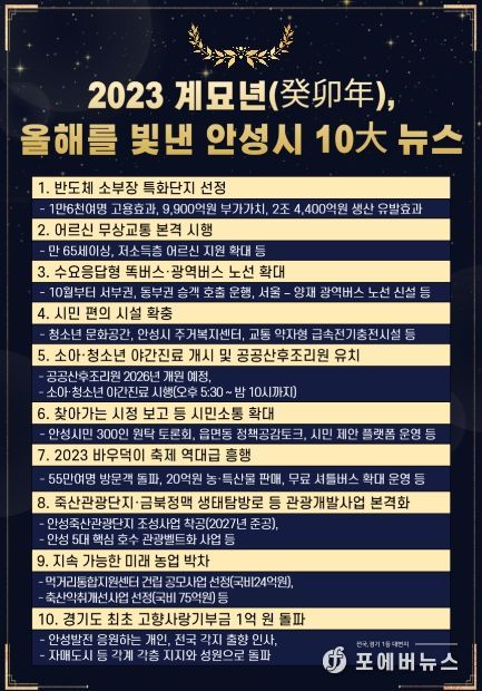 [ 포에버뉴스 최진성 기자 ] 안성시는 2023년 계묘년을 마무리하며 그간의 추진사업과 성과를 토대로 올해를 빛낸 10대 뉴스를 선정했다고 밝혔다.