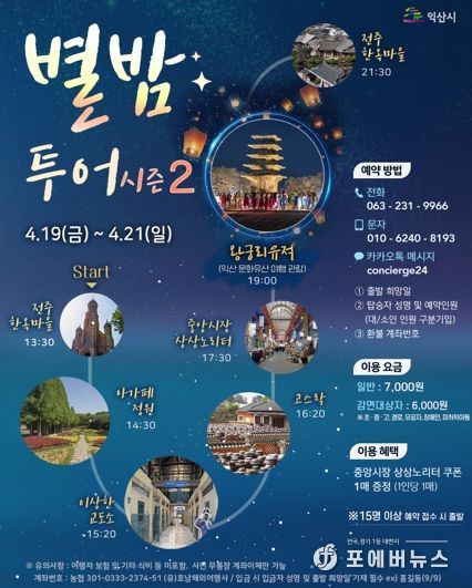 별밤 투어는 '익산 문화유산 야행(夜行)'과 '서동축제'를 연계한 야간 시티투어로 축제 일정에 맞춰 오는 19~21일과 5월 3~6일에 운영된다.