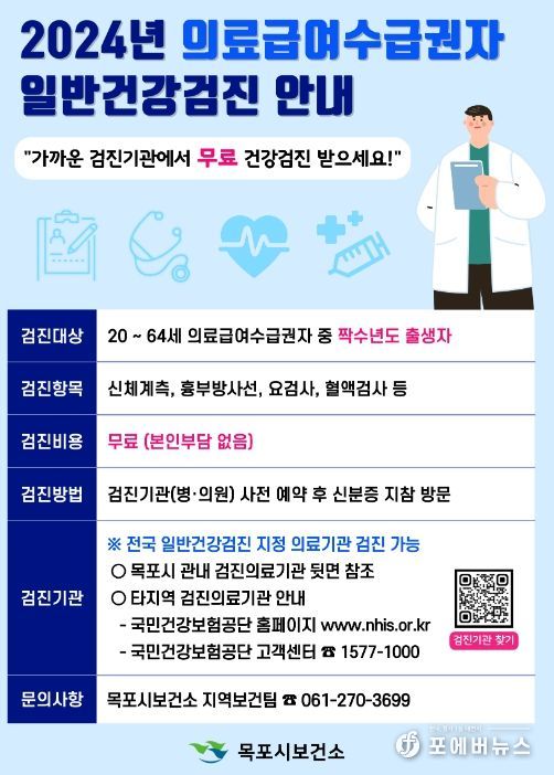 2024년 올해 의료급여수급권자 중 일반건강검진 대상자는 20~64세 짝수년도 출생자로, 검진 항목은 신체계측, 흉부방사선, 요검사, 혈액검사 등이며 검진 비용은 무료다.