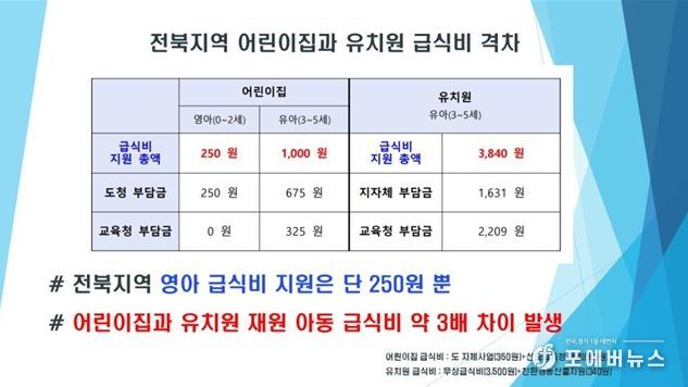 현재 유보통합 선도교육청으로 선정되어 선도사업을 추진중인 도교육청의 경우 한쪽에서는 유치원과 어린이집의 격차 완화를 위해 전북특별자치도와 협의를 이어가고 있지만, 다른 한쪽에서는 유치원 무상교육비를 지속적으로 증액시키며 어린이집과 유치원의 격차를 키우고 있어 현재 도교육청의 유보통합에 대한 의지가 있는지 의문이다.