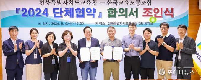 [ 포에버뉴스 이승훈 기자 ] 전북특별자치도교육청과 한국교육노동조합은 4일 도교육청 5층 회의실에서 ‘2024 단체협약 합의서 조인식’을 가졌다.