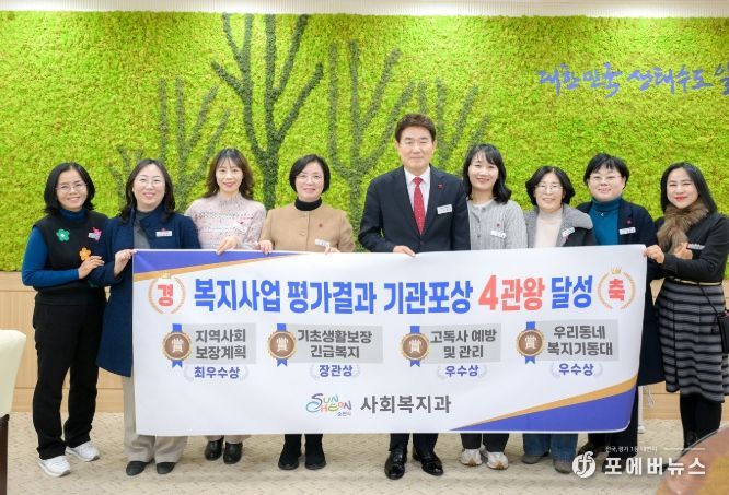 [ 포에버뉴스 오명숙 기자 ] 순천시는 2024년 복지분야에서 보건복지부와 전라남도지사 표창 등 총 4개의 주요 평가 ‘기관포상 4관왕’을 달성하며 시의 복지 혁신 전략이 탁월한 효과를 내고 있음을 다시 한번 증명했다.