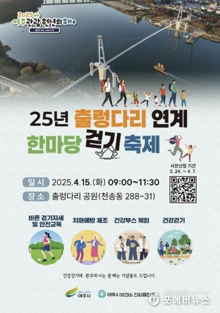 [ 포에버뉴스 김경순 기자 ] 여주시 보건소는 오는 4월 15일 9:00부터 출렁다리 공원(신륵사방면)에서 『25년 출렁다리 연계 한마당 걷기 축제』를 개최한다고 밝혔다.