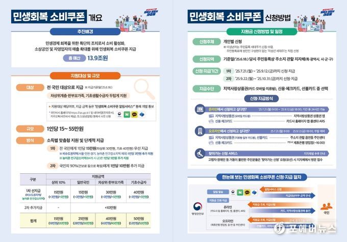 소비쿠폰은 접수 둘째 주에 접어든 7월 28일부터 요일제가 해제됐다. 출생연도와 관계없이 누구나 온·오프라인으로 신청할 수 있으며, 신청 마감은 9월 12일까지다. 온라인은 카드사 홈페이지와 지역사랑상품권 앱(chak)을 통해, 오프라인은 읍면동사무소 및 지정 은행 영업점에서 신청 가능하다.