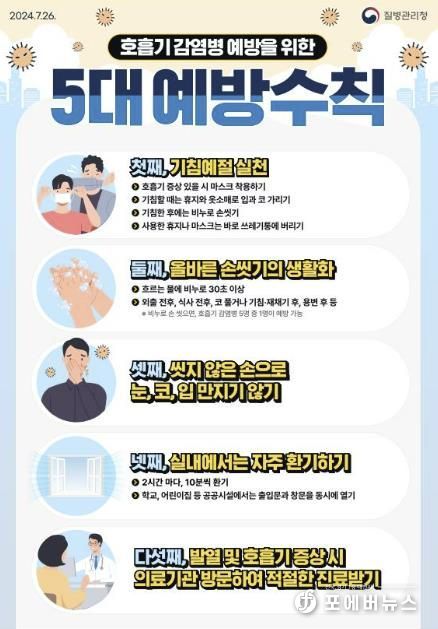 ▲기침 예절 실천 ▲흐르는 물에 30초 이상 손 씻기 ▲씻지 않은 손으로 얼굴(눈·코·입) 만지지 않기 ▲2시간마다 10분 이상 실내 환기 ▲호흡기 증상 시 마스크 착용 및 의료기관 방문 등이다.