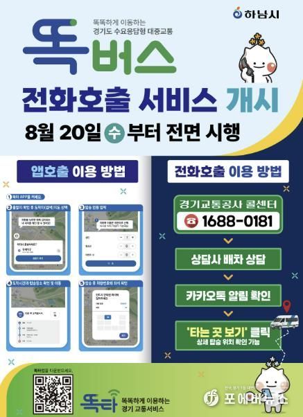 [ 포에버뉴스 김경순 기자 ] 하남시는 오는 8월 20일부터 감일·위례 지역에서 운행 중인 수요응답형 버스(DRT) '똑버스'의 전화 호출 서비스를 시작한다고 밝혔다.