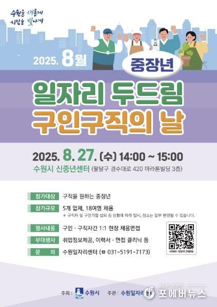 [ 포에버뉴스 김경순 기자 ] 수원시는 8월 27일 오후 2시부터 3시까지 수원시신중년센터에서 ‘8월 일자리 두드림 구인·구직의 날’ 행사를 개최한다.