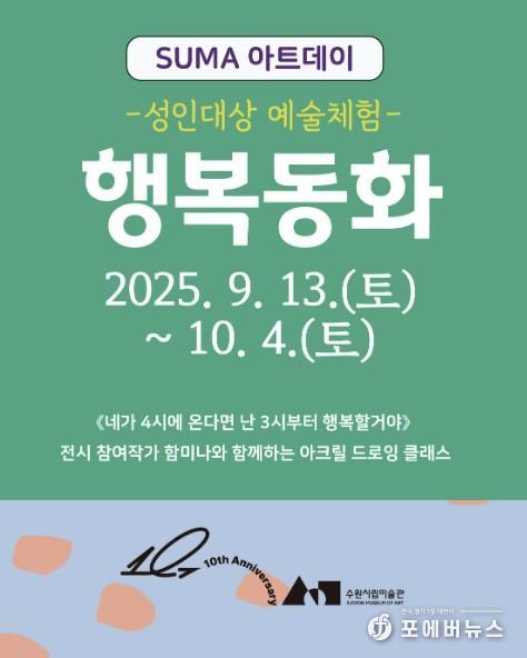 [ 포에버뉴스 김경순 기자 ] 경기도 수원시립미술관은 전시와 출품 작품에 대한 이해를 높이기 위한 전시 연계 실기 체험 강좌 'SUMA 아트데이: 행복동화'를 운영하며 참여자를 모집한다.