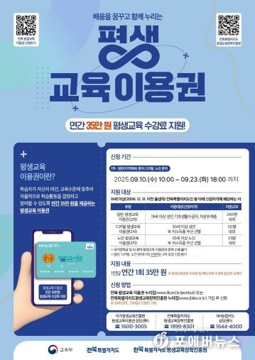 [ 포에버뉴스 이승훈 기자 ] 전북특별자치도와 전북특별자치도평생교육진흥원은 오는 10일부터 23일까지‘전북특별자치도 평생교육이용권(바우처)’2차 모집을 실시한다고 밝혔다. 이번 모집은 1차 모집에서 미선정된 도민에게도 평생교육 참여 기회를 보장하기 위해 마련됐다.