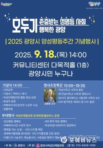 [ 포에버뉴스 오명숙 기자 ] 광양시는 오는 9월 18일 오후 2시, 커뮤니티센터 다목적홀에서 2025년 양성평등주간 기념행사를 개최한다고 밝혔다.