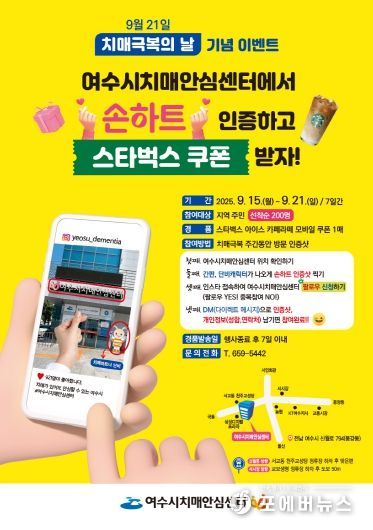 이번 이벤트는 치매극복주간에 여수시치매안심센터를 방문해 인증 사진을 남긴 참여자 중 선착순 200명에게 스타벅스 모바일 쿠폰을 증정하는 행사로, 지역 주민 누구나 참여할 수 있다.