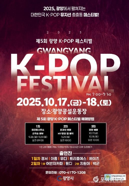 이현주 관광과장은 “오는 28일 티켓오픈을 시작으로 제5회 광양 K-POP 페스티벌에 대한 관심이 한층 뜨거워질 것으로 예상한다”며 “입장권 배부 일정과 달라진 예약 방식을 미리 숙지하면 원하는 좌석을 확보하는 데 도움이 될 것”이라고 말했다.