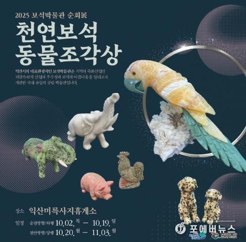 [ 포에버뉴스 이승훈 기자 ] 익산시 보석박물관은 추석 연휴가 시작되는 10월 2일부터 11월 3일까지 익산미륵사지휴게소(양방향)에서 '천연보석 동물조각상' 순회전시를 진행한다.