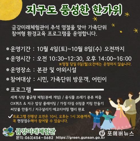 금강미래체험관은 오는 4일부터 8일까지 닷새간 본관과 야외시설 일대에서 ‘지구도 풍성한 한가위’를 주제로 한 특별 프로그램을 운영한다.