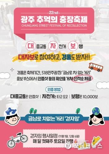 [ 포에버뉴스 오명숙 기자 ] 광주 동구는 오는 15일부터 5일간 금남로와 충장로 일원에서 열리는 제22회 광주 추억의 충장축제에서 ‘금남로 차 없는 거리’의 가치를 알리고 대자보 도시 정책에 시민 참여를 확대하기 위한 특별 홍보 이벤트를 진행한다고 밝혔다.