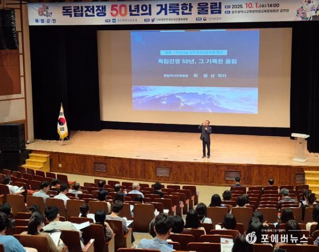[ 포에버뉴스 오명숙 기자 ] 광주시교육청은 1일 학생교육문화회관 공연장에서 광복 80주년을 맞아 인문학 강연 ‘독립운동 50년의 거룩한 울림’을 진행했다.
