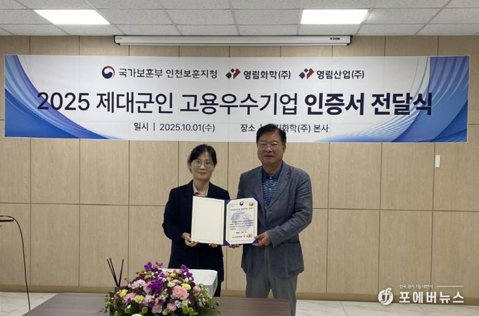 [ 포에버뉴스 김경순 기자 ] 국가보훈부 인천보훈지청(지청장 직무대리 최은진) 제대군인지원센터는 2025년 10월 1일에 제대군인 주간을 맞아 영림그룹의 계열사인 영림화학(주)과 영림산업(주)을 방문하여 제대군인 고용 우수기업인증에 대한 현판식을 개최했다.