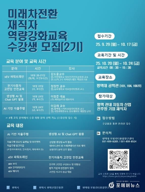 [ 포에버뉴스 김경순 기자 ] 평택시와 평택산업진흥원이 ‘미래차 전환 재직자 역량 강화교육’ 2기 과정을 개설한다. 교육은 10월 20일부터 24일까지 교육 운영기관인 평택대학교에서 진행되며, 지역 자동차 산업 재직자를 대상으로 미래차 핵심 분야 전문지식을 제공한다.