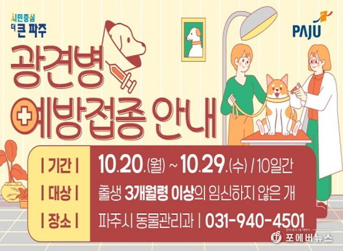 시는 하반기 광견병 예방사업을 위해 예방백신 4,500마리 분을 무상 지원하며, 예방접종을 희망하는 반려견 보호자는 33개 지정 동물병원을 방문해 시술비 1만 원만 부담하면 접종이 가능하다. 참여 동물병원 목록은 파주시청 누리집 공고문을 통해 확인할 수 있다.