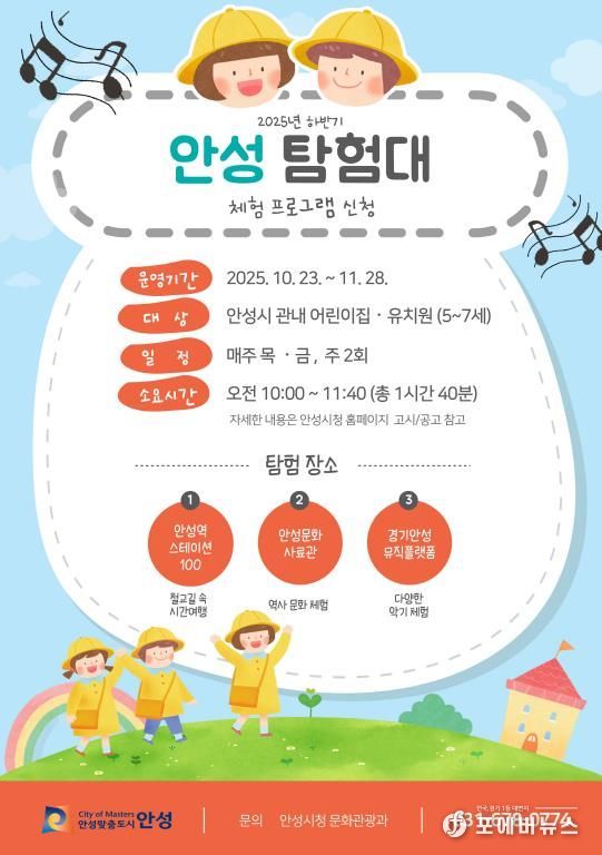 [ 포에버뉴스 김경순 기자 ] 안성시는 상반기에 시범 운영해 큰 호응을 얻은 유아 대상 체험형 프로그램 ‘안성 탐험대: 역사 속으로, 음악 속으로!’를 하반기에도 운영하며, 지역 문화시설 활성화에 나선다.