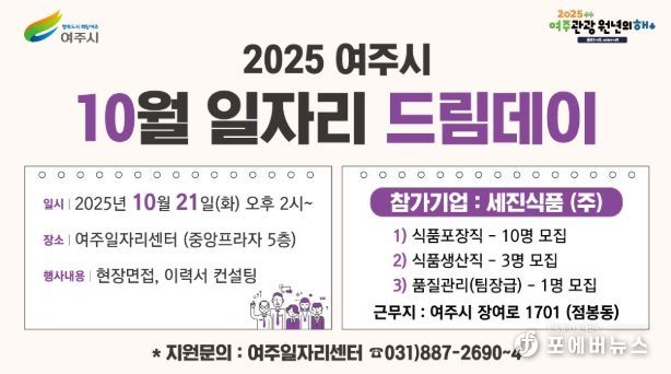 [ 포에버뉴스 박정배 기자 ] 여주시는 오는 10월 21일 오후 2시 여주일자리센터(세종로 14번길 18, 중앙프라자 5층)에서 ‘2025년 10월 일자리드림데이’를 연다.