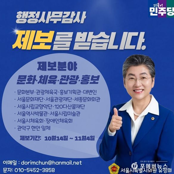 [ 포에버뉴스 김경순 기자 ] 서울특별시의회 문화체육관광위원회 유정희 의원(더불어민주당, 관악4)은 10월 14일부터 11월 4일까지 시민 의견을 직접 접수받는 ‘행정사무감사 시민제보창구’를 운영한다고 밝혔다.