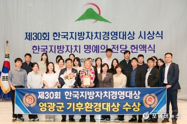 [ 포에버뉴스 오명숙 기자 ] 영광군이 지난 14일 (사)한국공공자치연구원이 주관한 ‘제30회 한국지방자치경영대상’에서 기후환경대상을 수상했다.
