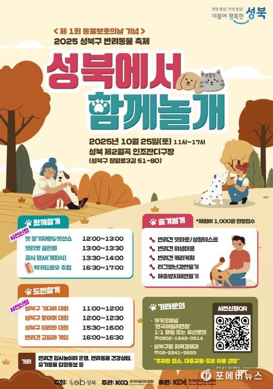 [ 포에버뉴스 김경순 기자 ] 서울 성북구가 2025년 성북구 반려동물 축제 ‘성북에서 함께놀개’를 오는 10월 25일 토요일 성북 제2월곡잔디구장에서 개최한다.