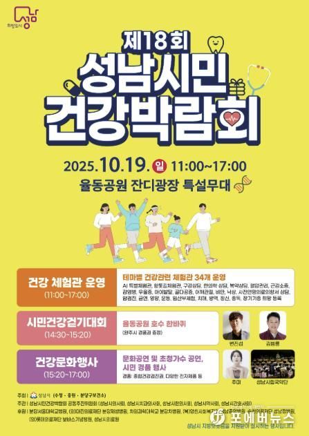 [ 포에버뉴스 김경순 기자 ] ‘제18회 성남시민 건강박람회’가 오는 10월 19일 오전 11시~오후 5시 율동공원 잔디광장에서 열린다.