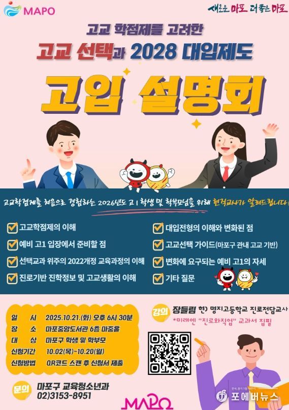 특히 예비 고1 학생의 관점에서 고교 진학 준비 방법과 마포구 관내 학교 선택 가이드를 함께 제시함으로써, 실질적인 진학 방향을 세우는 데 도움이 될 것으로 기대하고 있다.