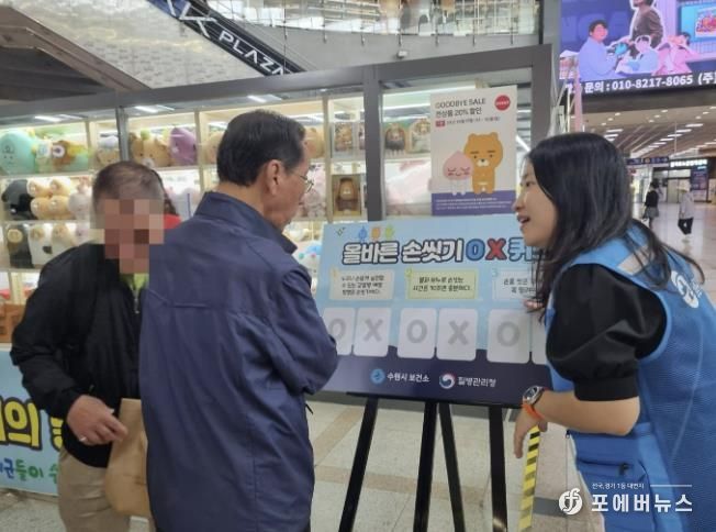 [ 포에버뉴스 김경순 기자 ] 수원시보건소는 ‘세계 손씻기의 날’(10월 15일)을 맞아 15일 수원역 2층 대합실에서 감염병 예방 캠페인을 펼쳤다.