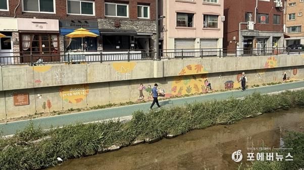 [ 포에버뉴스 김경순 기자 ] 방학천(금강아미움 맞은편~방학교) 옹벽 약 360m 구간이 걷고 싶고 머무르고 싶은 산책길로 탈바꿈했다.