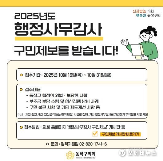 [ 포에버뉴스 김경순 기자 ] 동작구의회는 오는 11월 25일부터 9일간 진행되는 ‘2025년도 행정사무감사’를 앞두고, 10월 16일부터 31일까지 구민 제보를 접수한다.