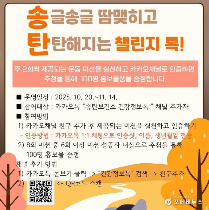 [ 포에버뉴스 김경순 기자 ] 평택시 송탄보건소는 10월 20일부터 11월 14일까지 카카오톡을 활용한 ‘(송)글송글 땀 맺히고 (탄)탄해지는 챌린지 톡!’을 운영할 예정이라고 밝혔다.