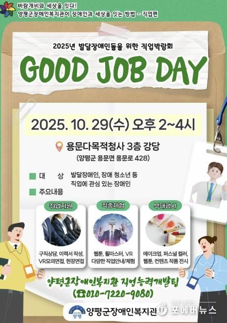 [ 포에버뉴스 박정배 기자 ] 대한불교조계종사회복지재단이 운영하는 양평군장애인복지관은 오는 29일 오후 2시부터 4시까지 용문다목적청사 3층 강당에서 발달장애인의 직업 탐색 기회를 지원하기 위한 직업박람회 ‘GOOD JOB DAY’를 개최한다.