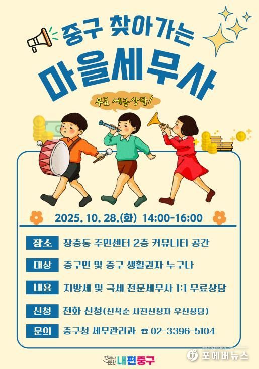 [ 포에버뉴스 김경순 기자 ] 서울 중구가 오는 28일 장충동 주민센터에서 오후 2시부터 4시까지 '찾아가는 마을세무사'를 운영한다.