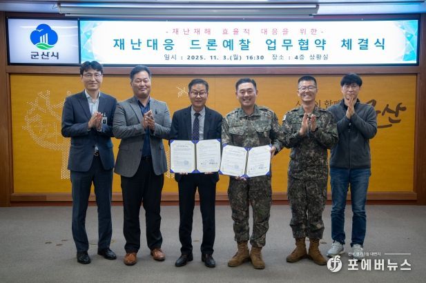[ 포에버뉴스 이승훈 기자 ] 군산시와 제9585부대 1대대는 3일 군산시청에서 ‘드론 예찰활동 업무협약’을 체결하고, 재난·재해 예방과 지역 안전 강화에 협력하기로 했다.
