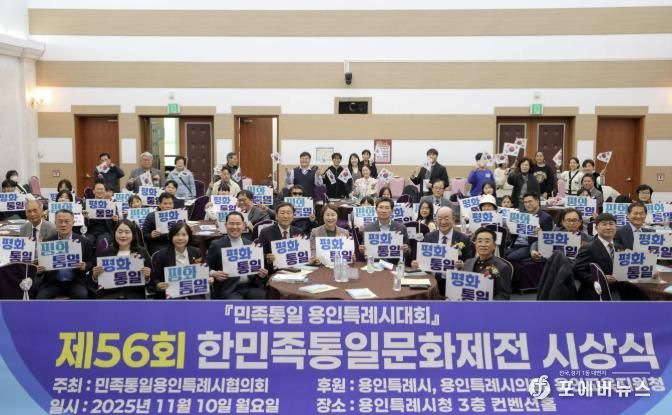 [ 포에버뉴스 김경순 기자 ] 용인특례시는 10일 시청 컨벤션홀에서 민족통일 용인특례시협의회 주관으로 ‘민족통일 용인특례시대회와 제56회 한민족통일문화제전 시상식’이 열렸다고 밝혔다.