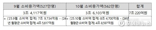 한편, 9·10월 환급(페이백) 지급 대상자(중복 포함, 1,089만명)가 작년 월평균 카드 소비액보다 총 7조 220억원을 더 지출한 것으로 확인됐다. 이는 지급액(6,430억원)의 11배에 달하는 규모다.