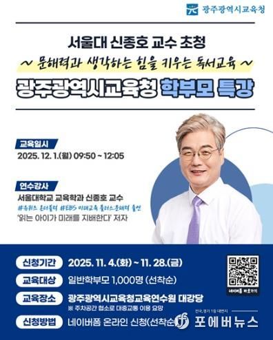 [ 포에버뉴스 오명숙 기자 ] 광주시교육청이 오는 12월 1일 오전 9시 40분 광주시교육청교육연수원 대강당에서 서울대학교 교육학과 신종호 교수 초청 학부모 특강을 진행한다.