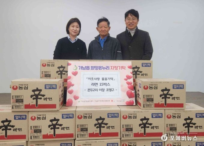 [ 포에버뉴스 박정배 기자 ] 가남읍행정복지센터는 지난 20일, 본두2리 조평구 이장이 관내 어려운 이웃들을 위해 라면 15박스를 기탁했다고 밝혔다.