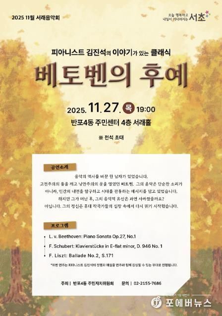 반포4동 주민자치위원회(위원장 장영화)가 주최하는 서래음악회는 매 분기 지역 주민들에게 다양한 음악적 경험을 제공하는 공연 프로그램이다. 이번 11월 서래음악회는 ‘베토벤’을 중심으로 고전주의를 넘어 낭만주의의 문을 연 그의 음악 정신이 후대 작곡가들에게 어떻게 계승됐는지를 보여줄 예정이다. 베토벤을 비롯해 슈베르트, 리스트 등 낭만주의 작곡가들의 작품을 한 무대에서 감상할 기회다.