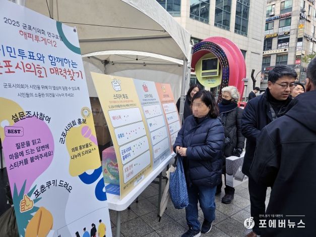 [ 포에버뉴스 김경순 기자 ] 군포시의회 의원연구단체 ‘시민과 함께하는 해피투게더 2’(대표의원 이훈미, 소속의원 이길호․박상현, 이하 해피투게더 2)가 시의원과 시의회에 대한 시민 인식을 조사하는 활동을 펼쳤다.